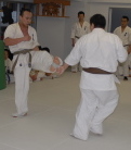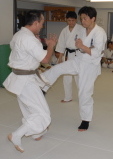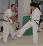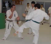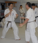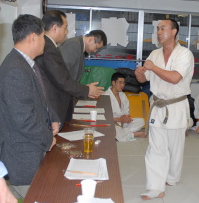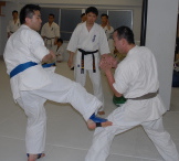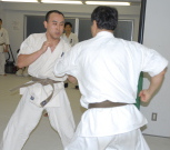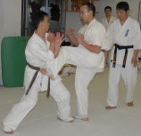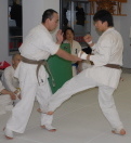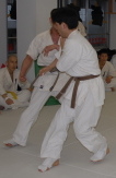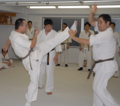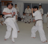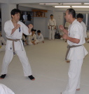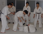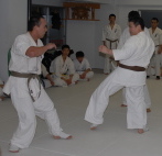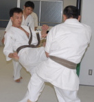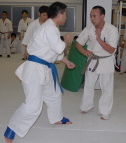 | 審査直後の感想 私は不器用でして、今まで師範にいろいろとご指導をいただき感謝している。審査を受けて、初めて十人組手をやったが、正直すごくつらくて途中で何度ももう無理だと思った。でもこれであきらめたら人生がだめになると思って耐えた。緑帯の人(綱島)とやったとき、自分を出し切ることができて、終わったら感無量で涙が出そうになった。極真をやって本当によかったと思う。歳を重ねていっても強くなる黒帯を目指したい。 |